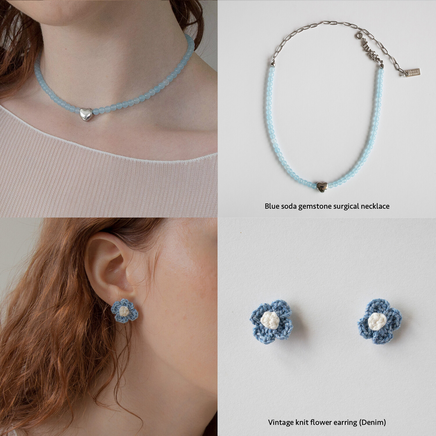 [Blue soda gemstone surgical necklace + Vintage knit flower earring (Denim)]
