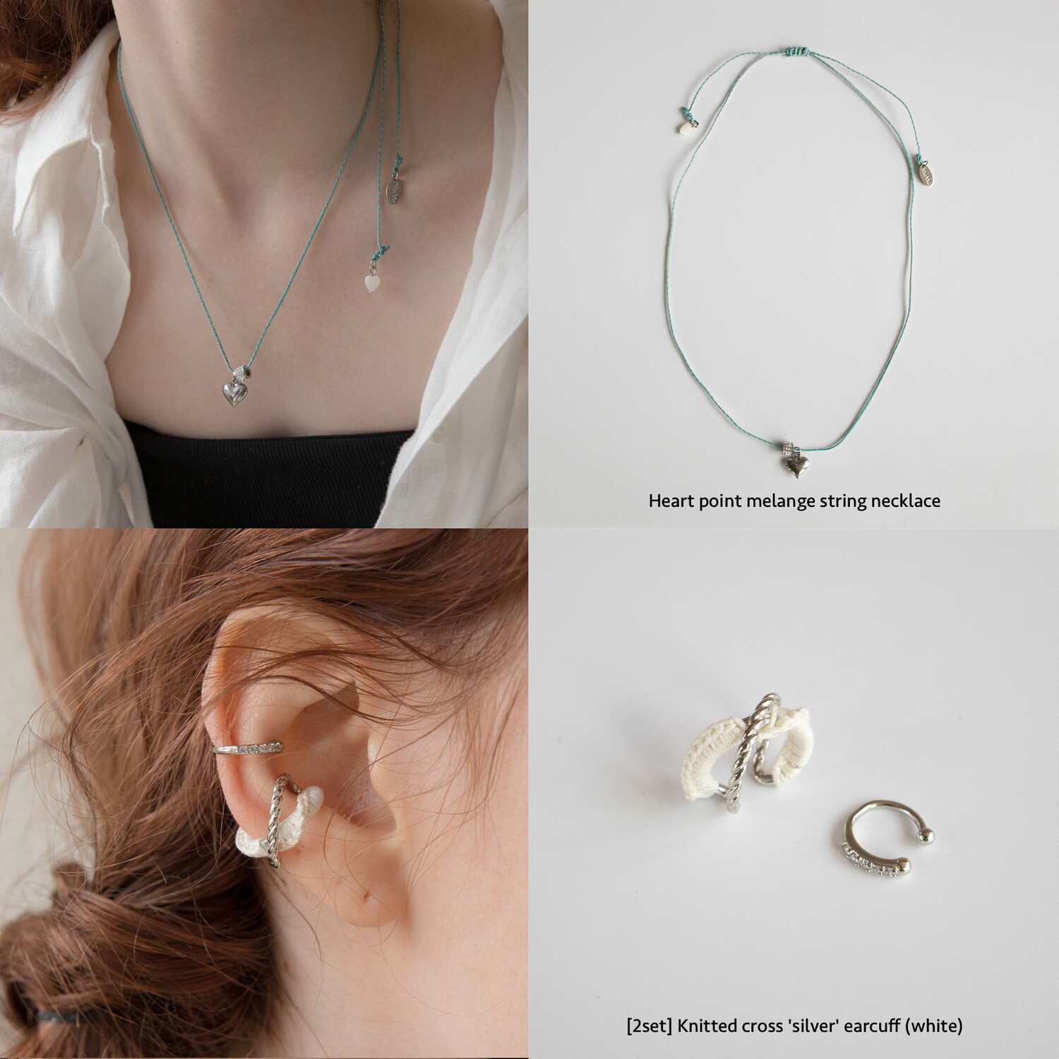 [Heart point melange string necklace + [2set] Knitted cross 'silver' earcuff(white)]