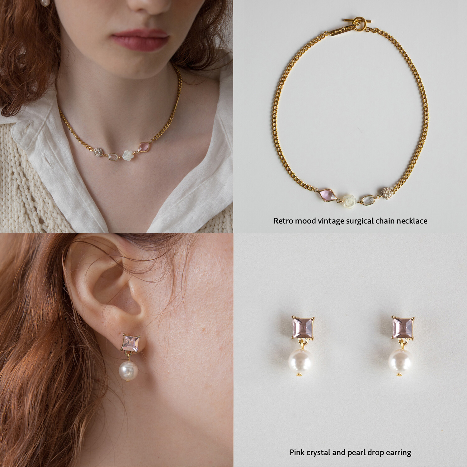 [Retro mood vintage surgical chain necklace + Pink crystal and pearl drop earring]