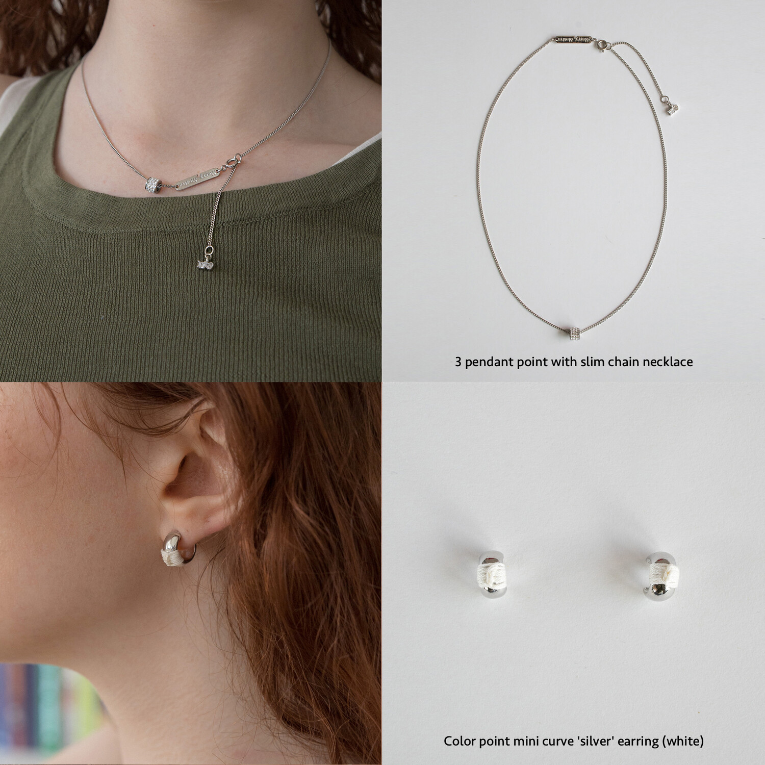 [3 pendant point with slim chain necklace + Color point mini curve 'silver' earring(white)]