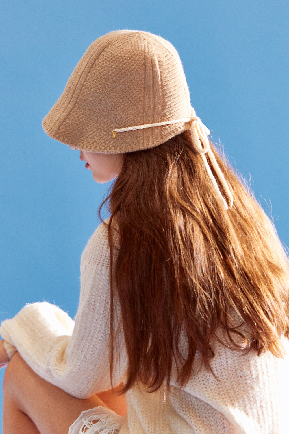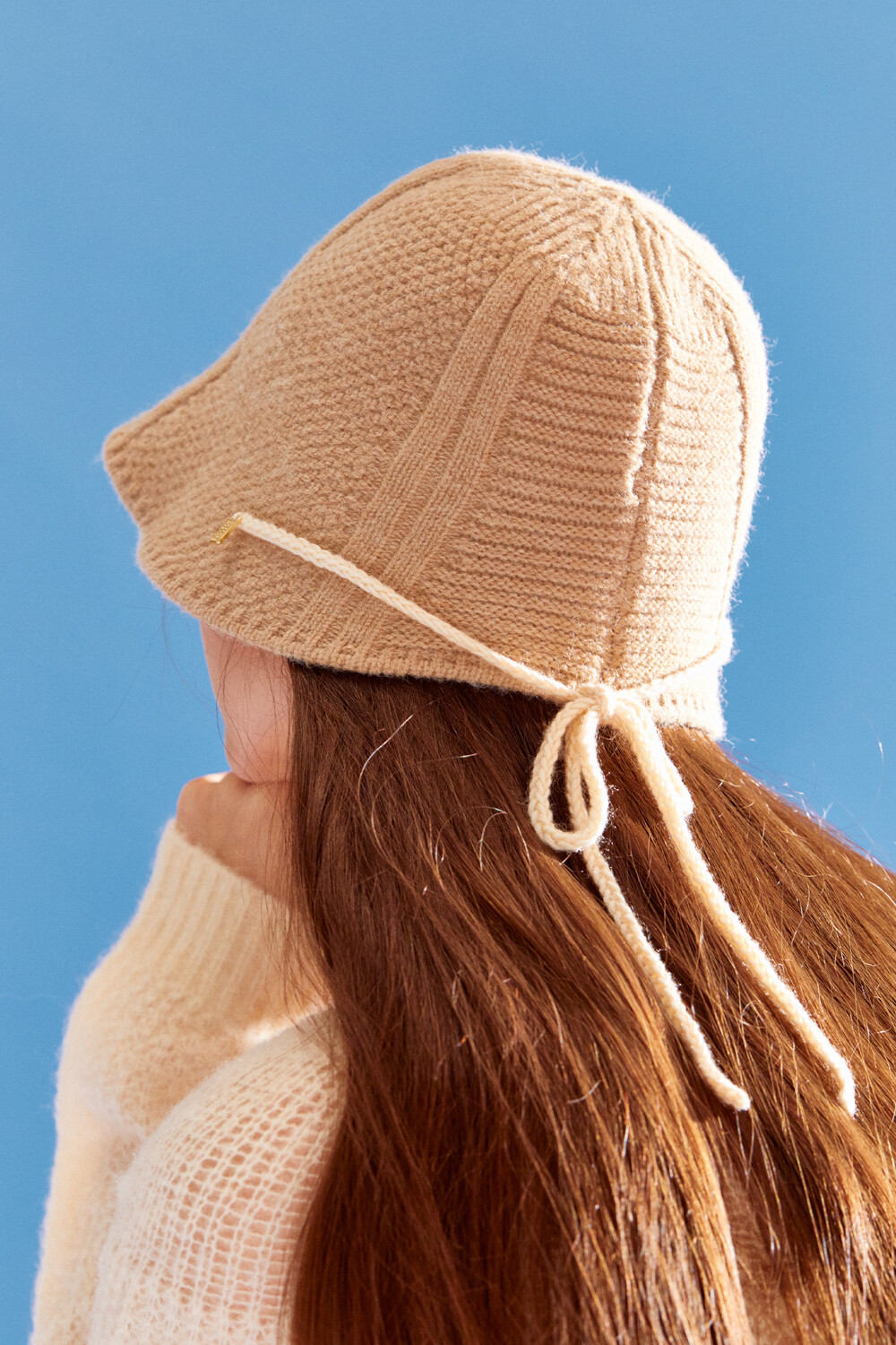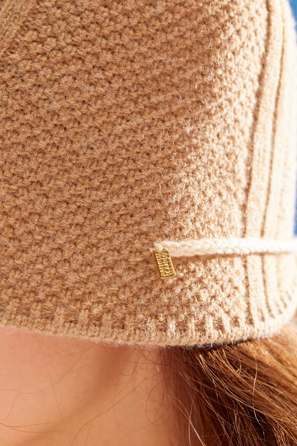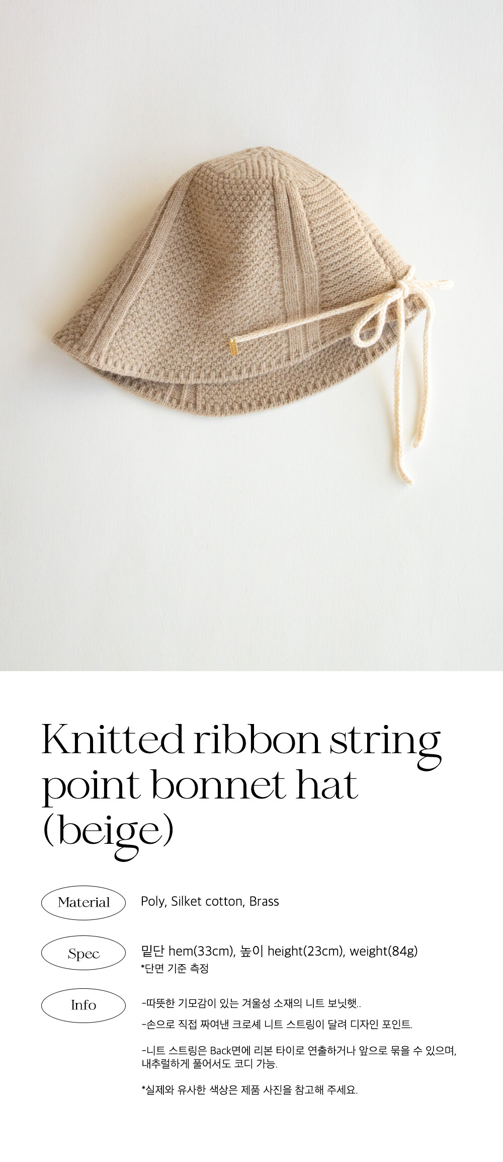Knitted ribbon string point bonnet hat (beige)