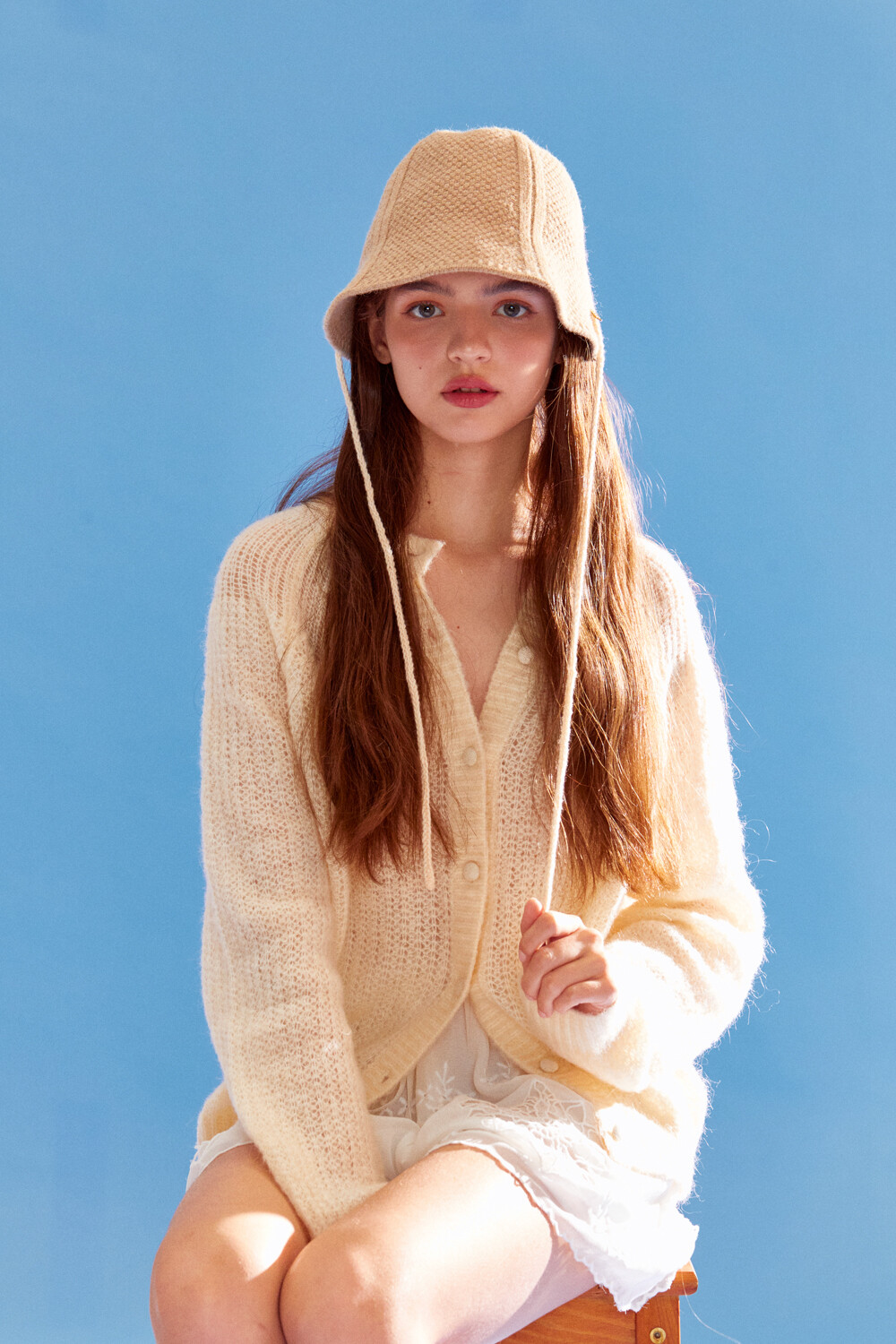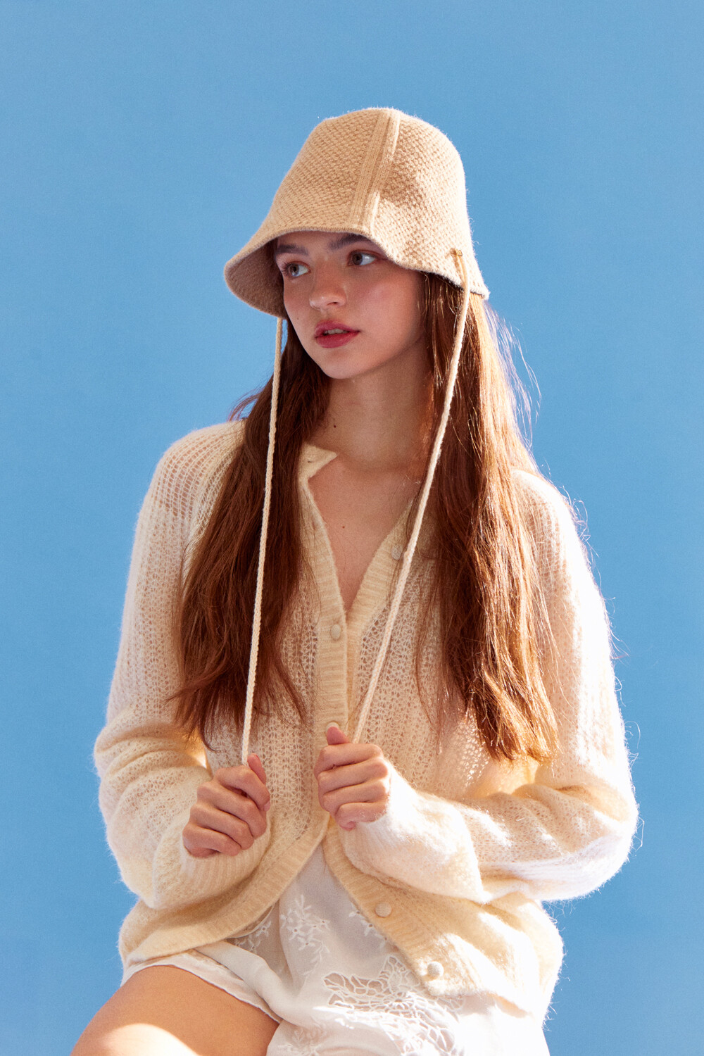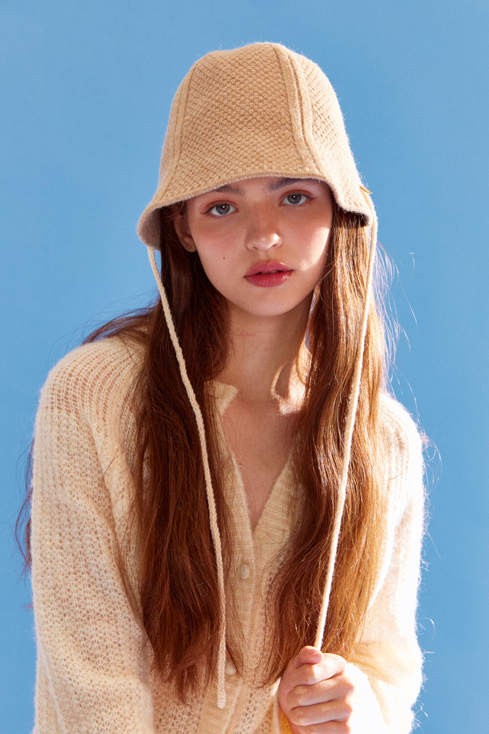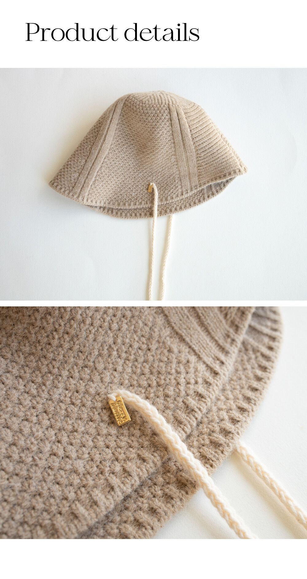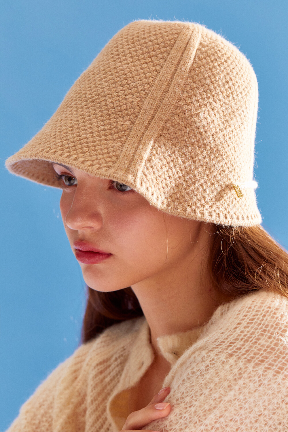 Knitted ribbon string point bonnet hat (beige)