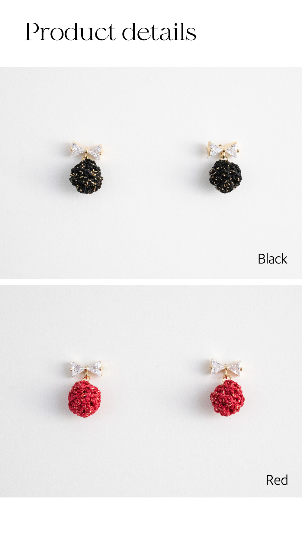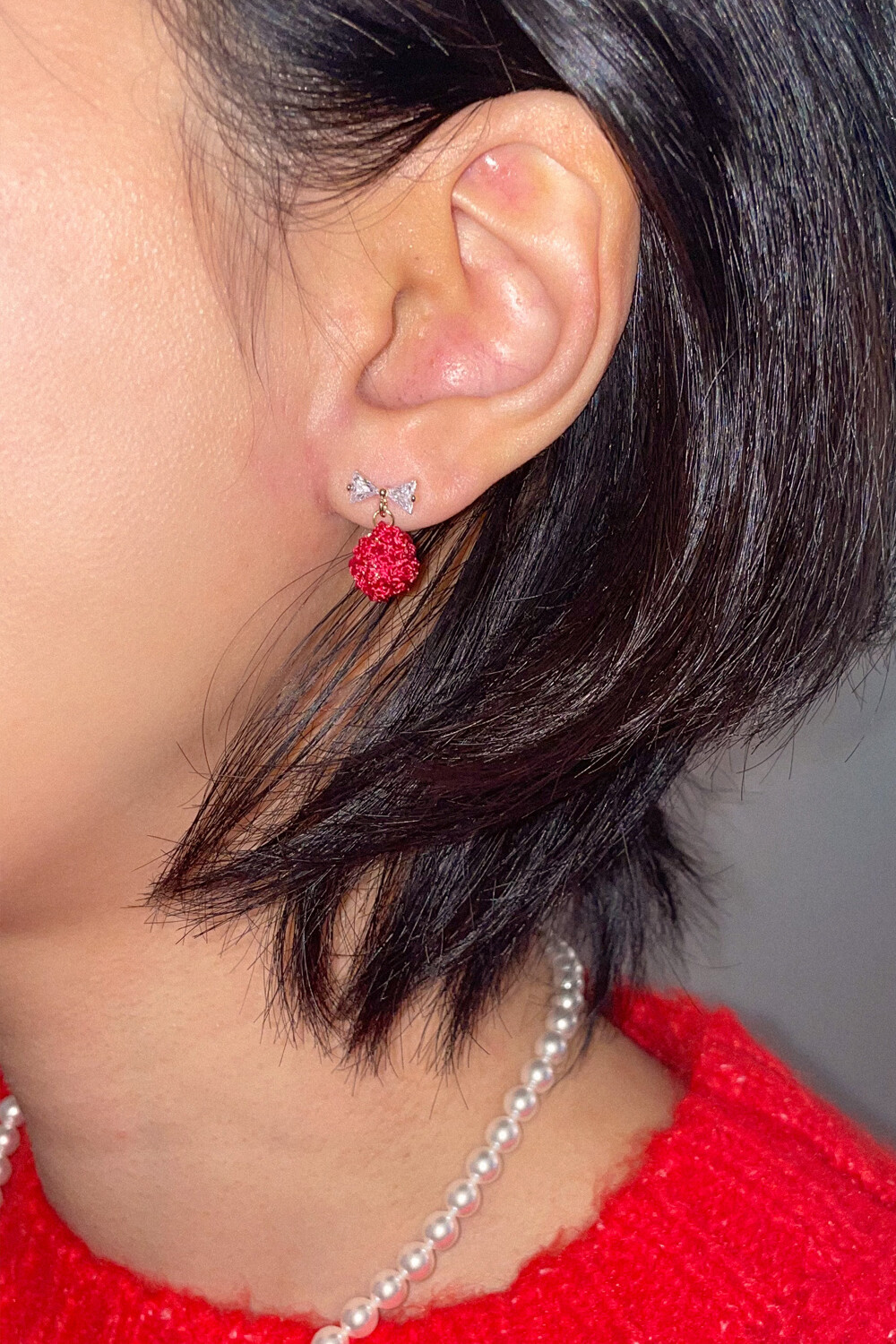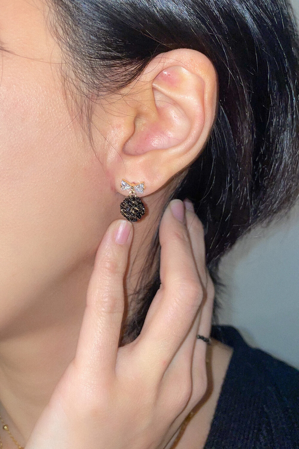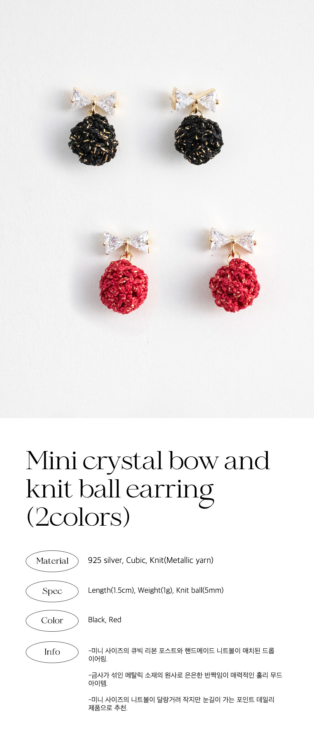 Mini crystal bow and knit ball earring (2colors)