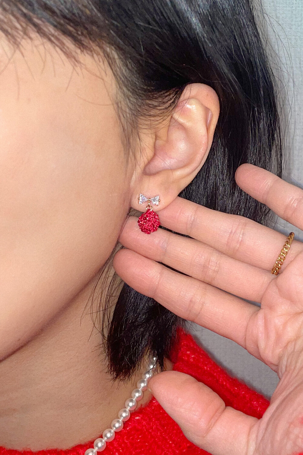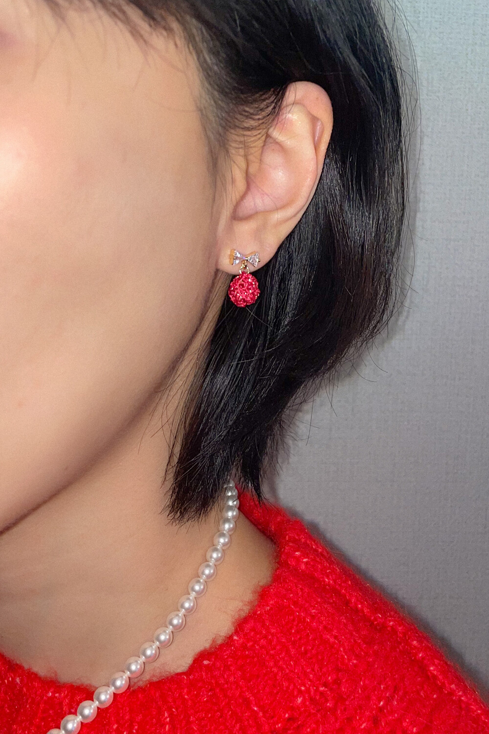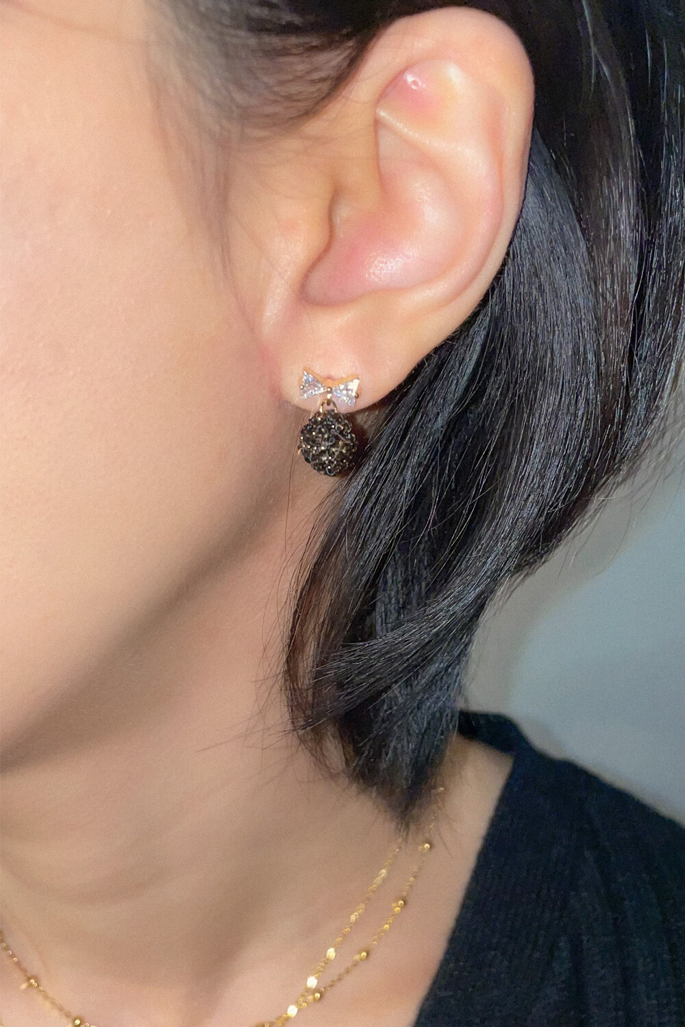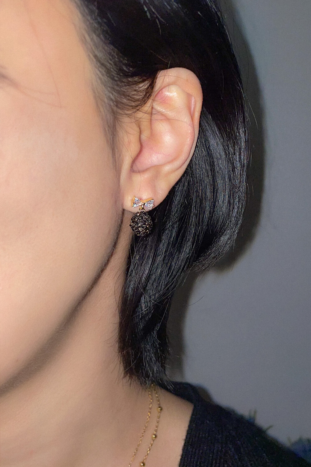 Mini crystal bow and knit ball earring (2colors)