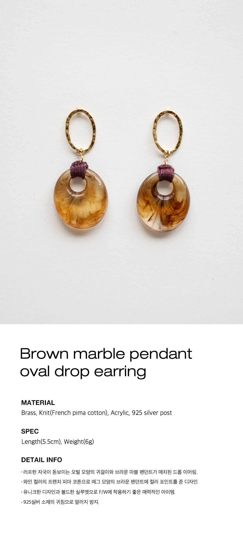 Brown marble pendant oval drop earring