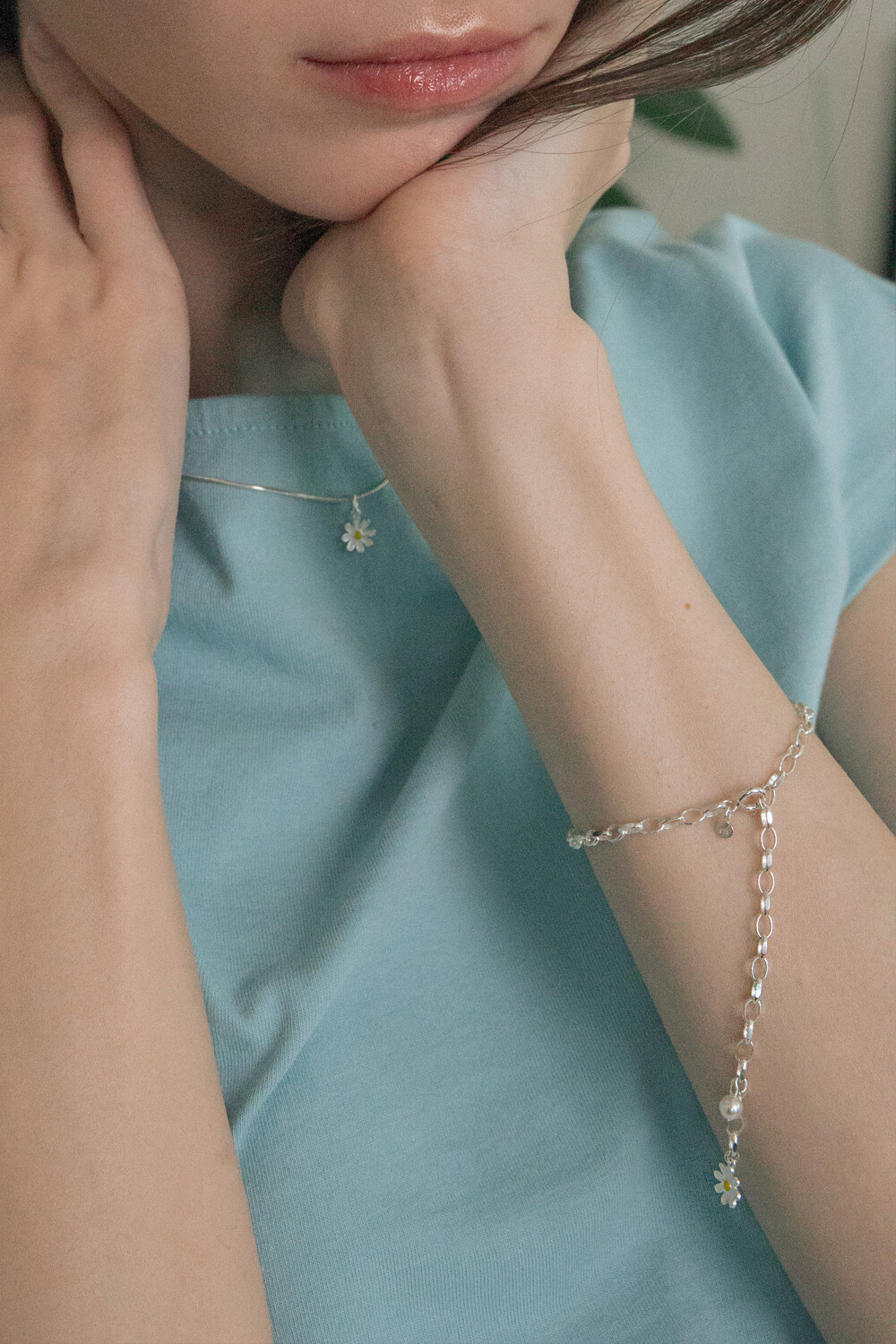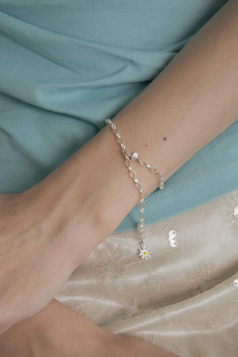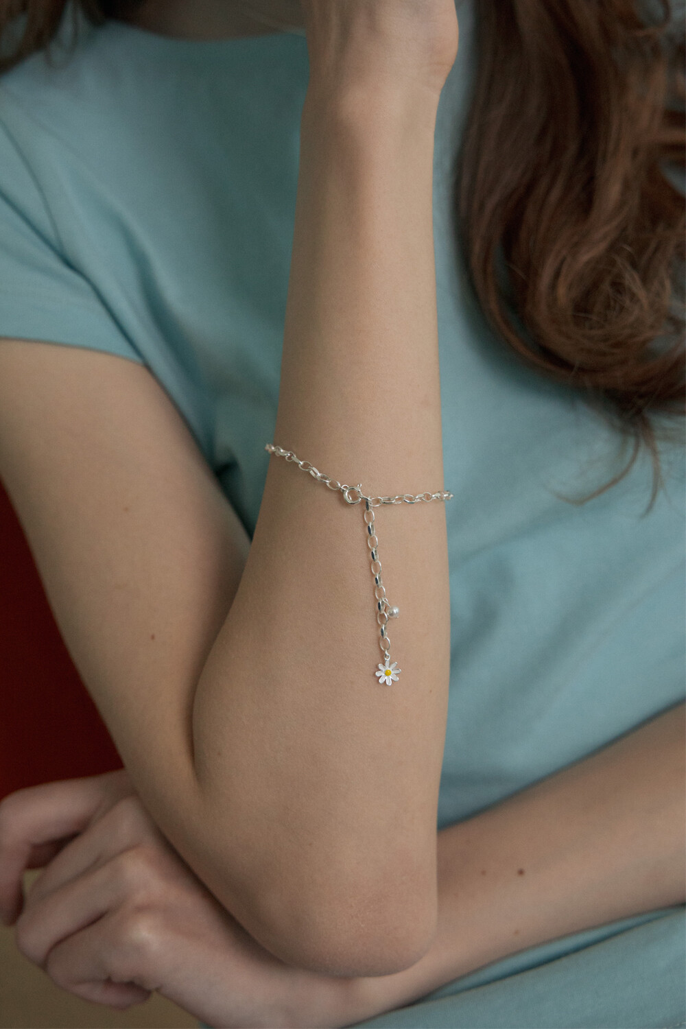 [Silver] Daisy flower and pearl bracelet