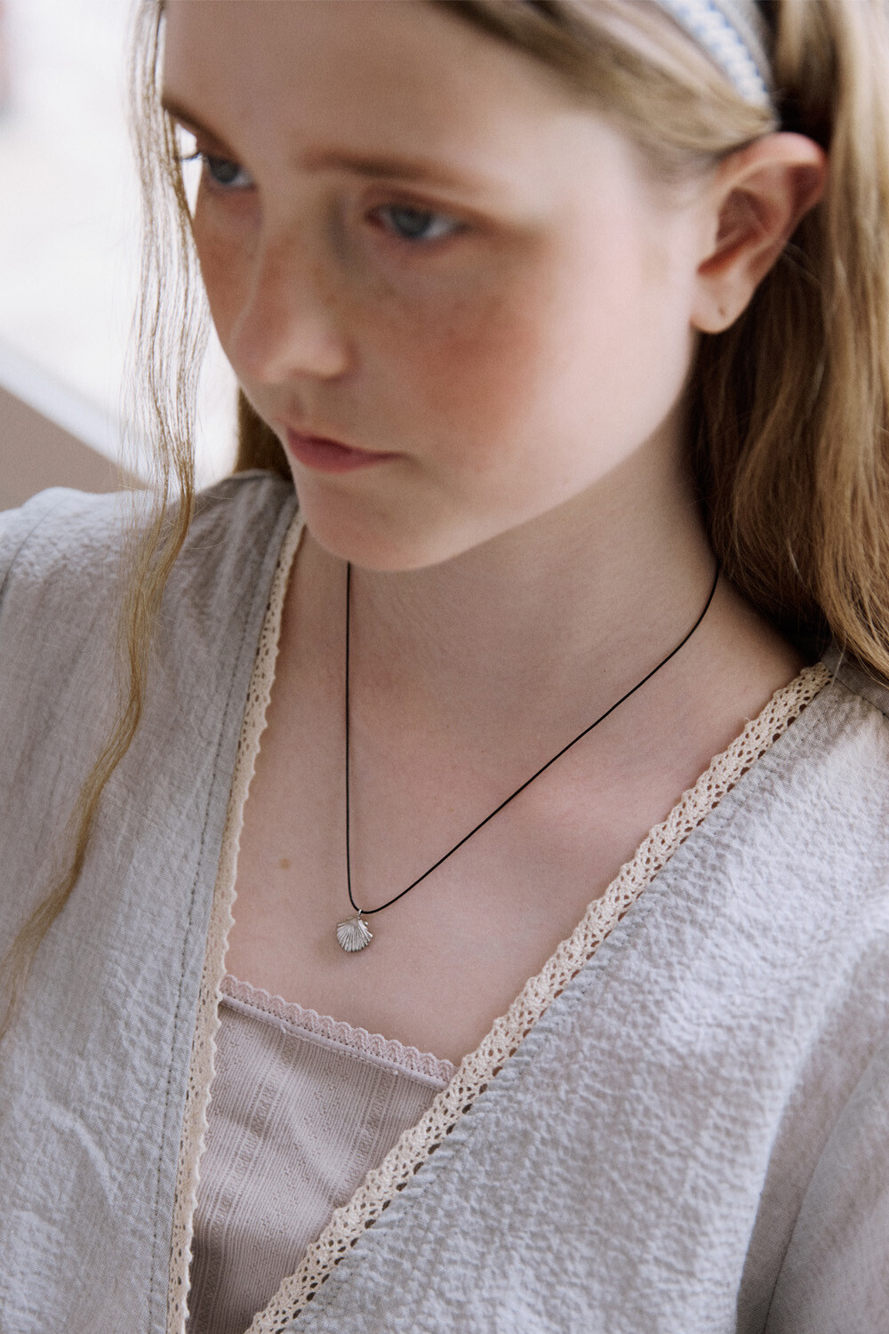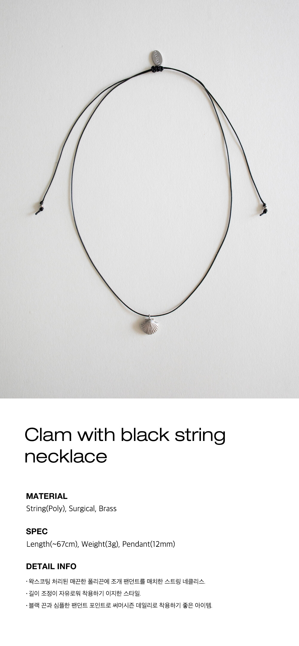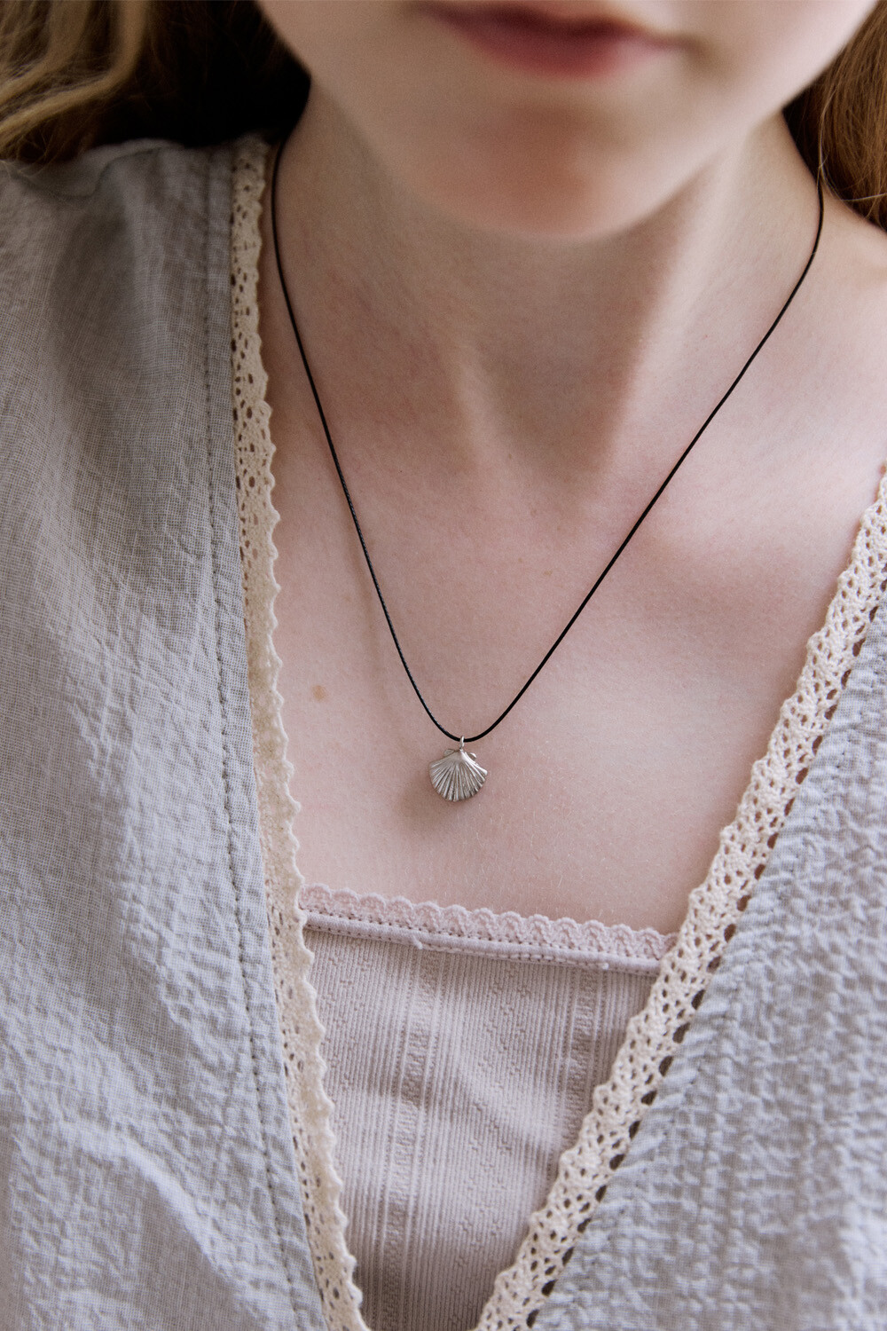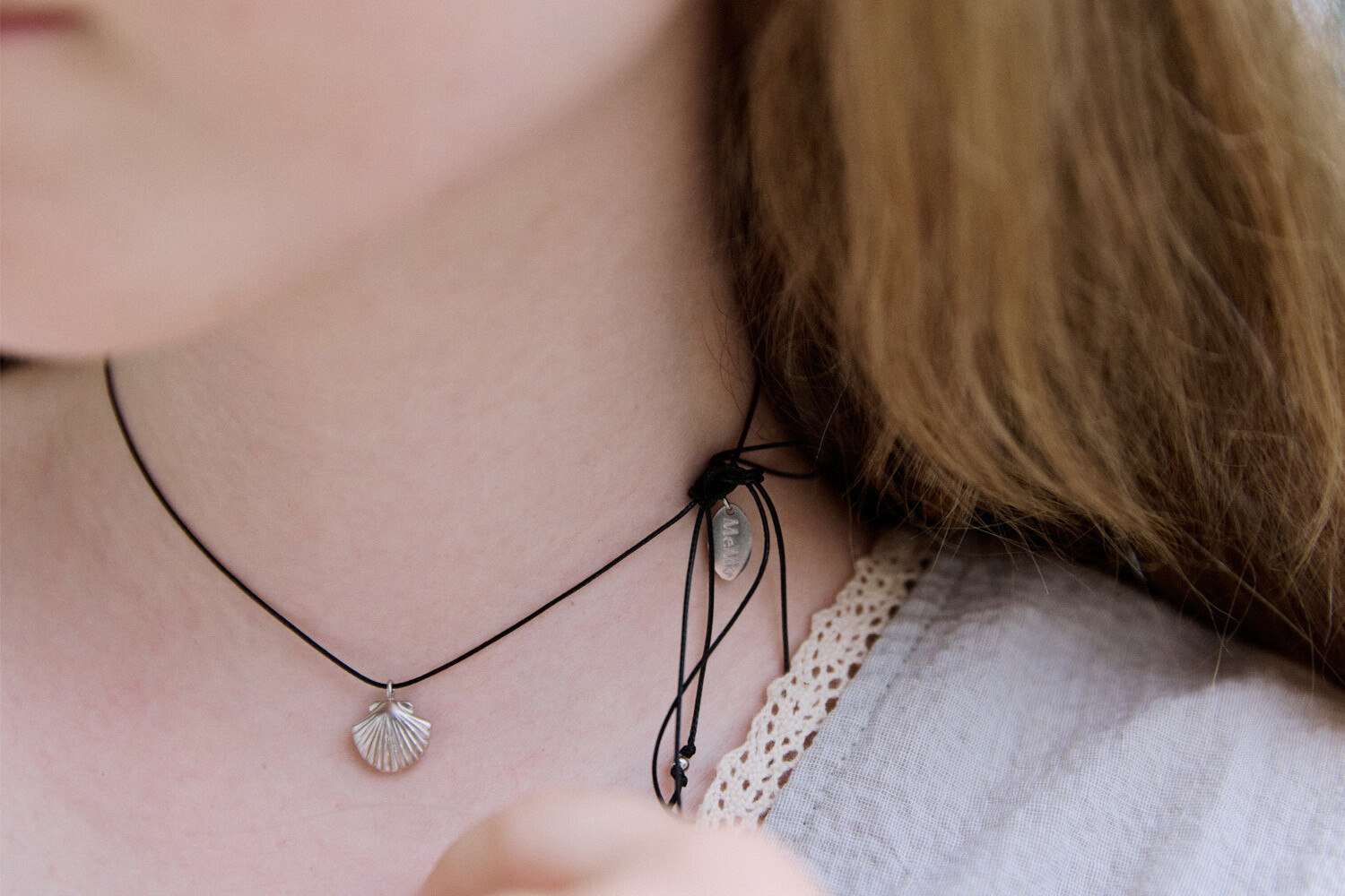 Clam with black string necklace