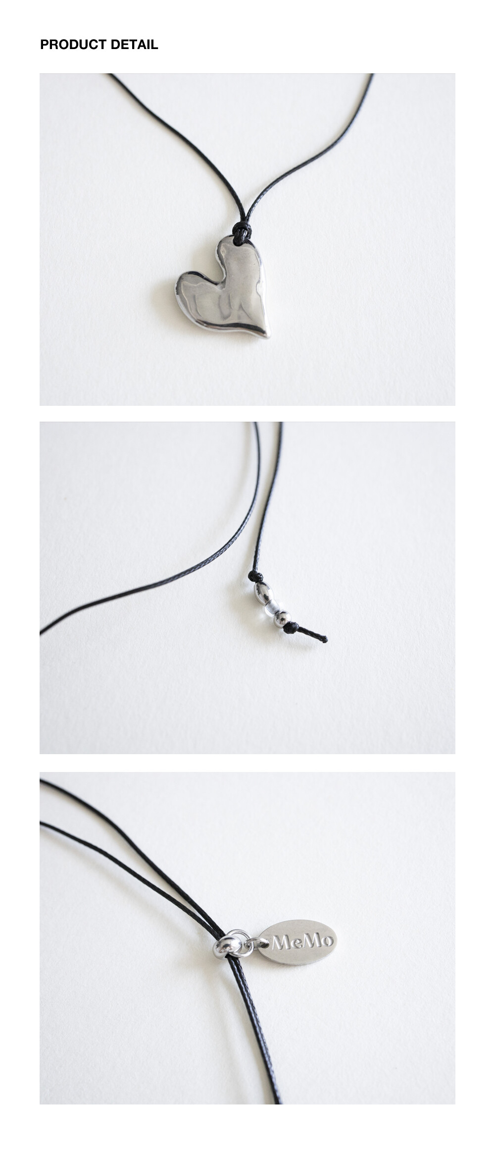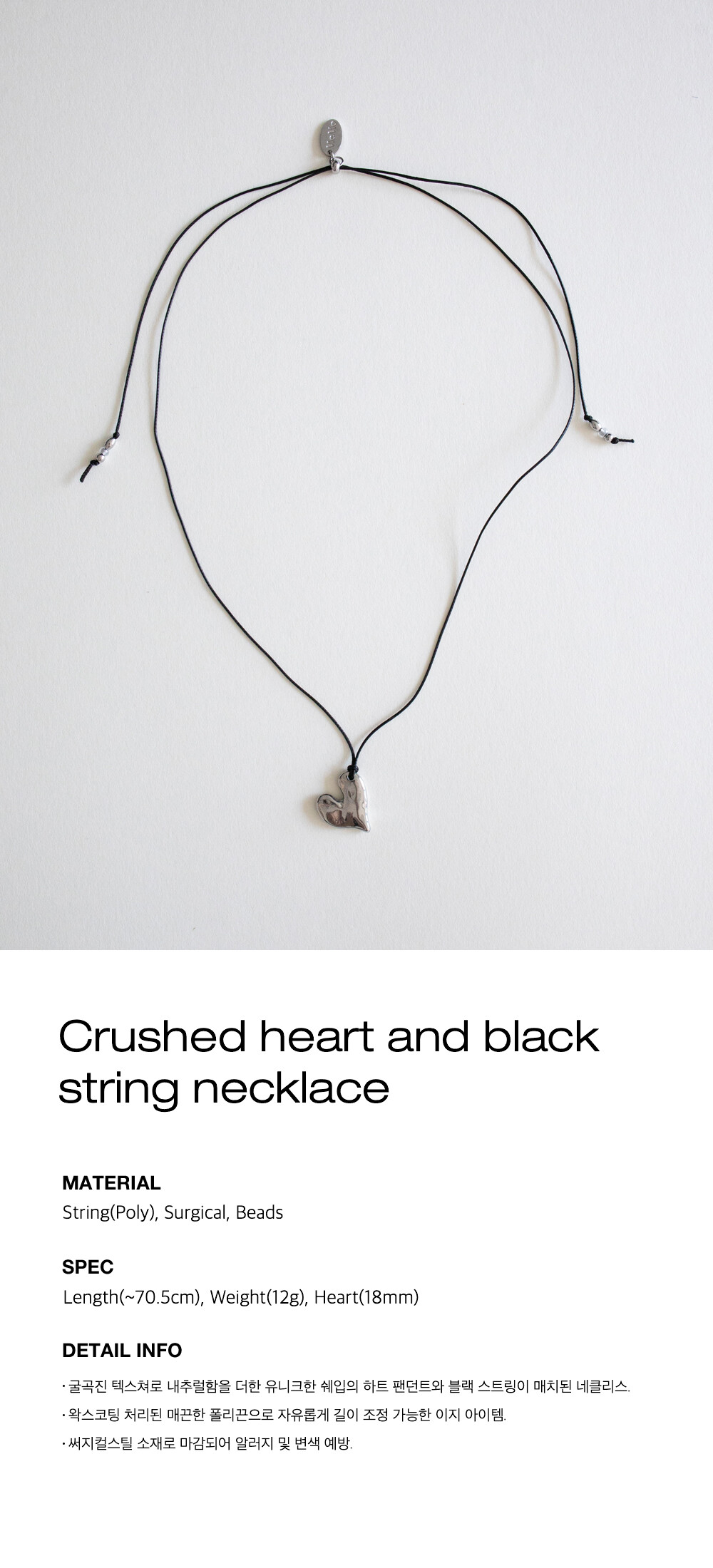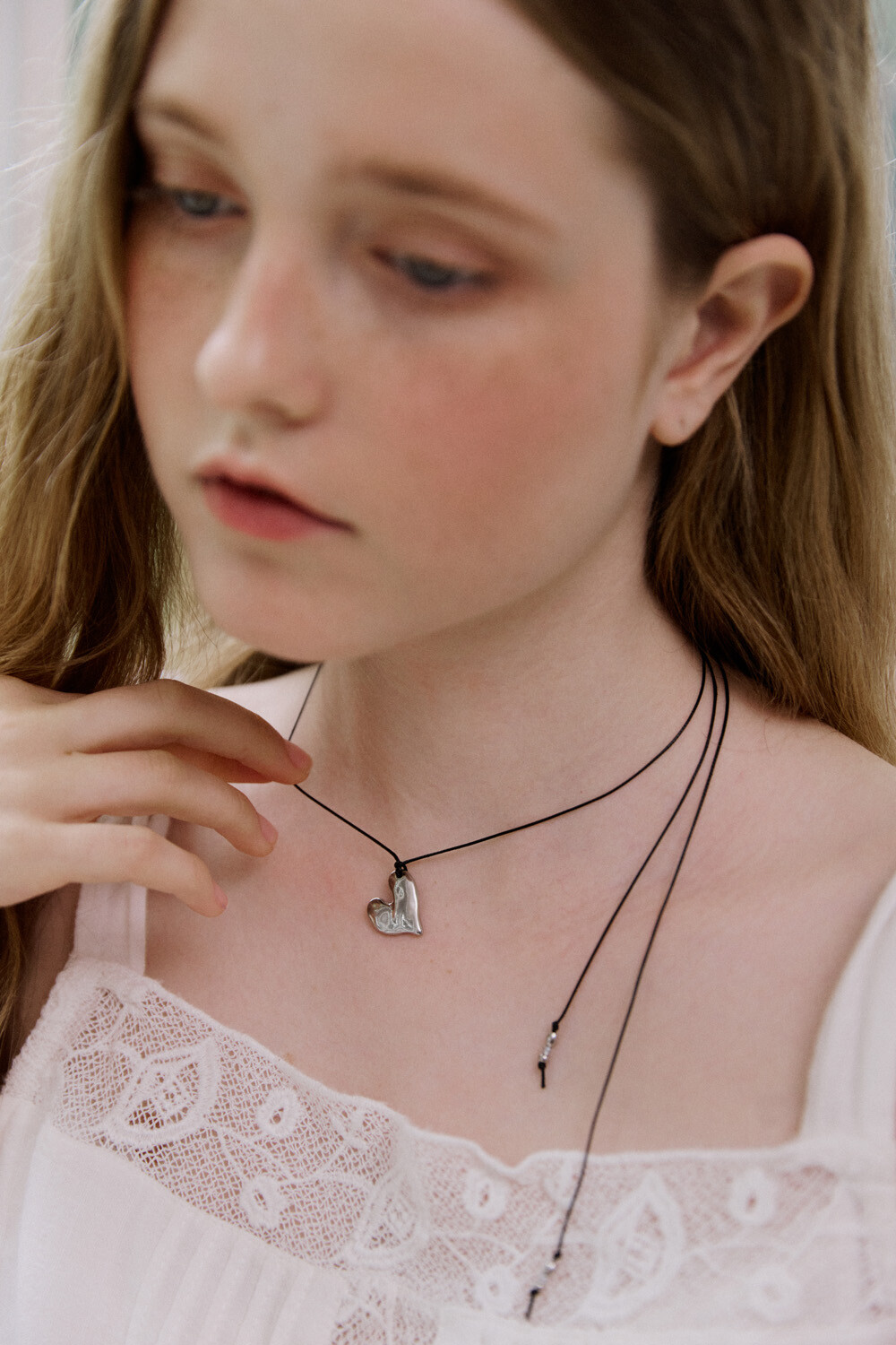 Crushed heart and black string necklace