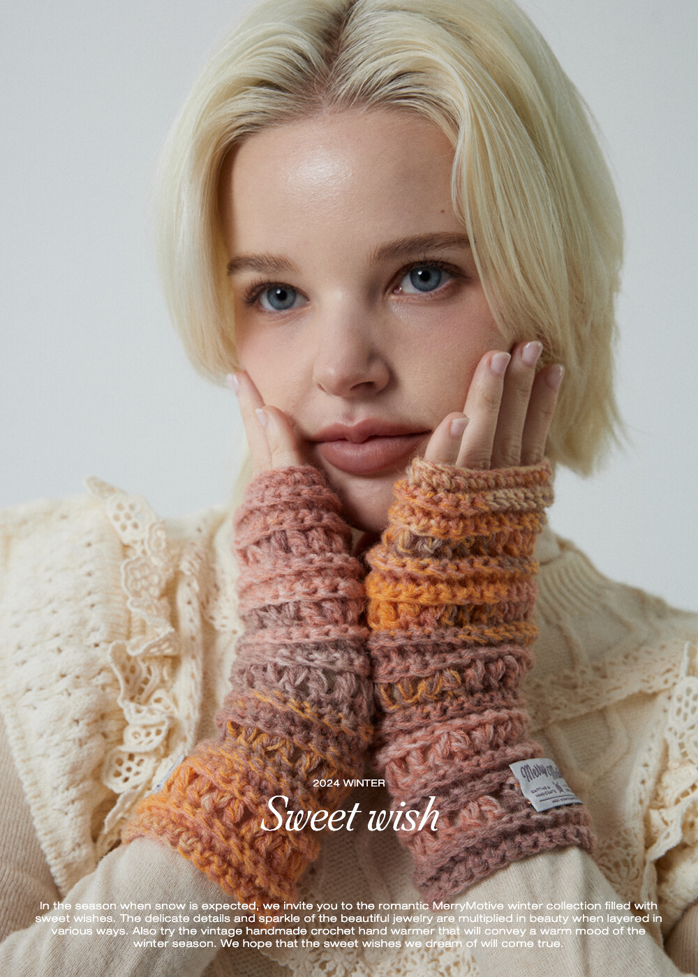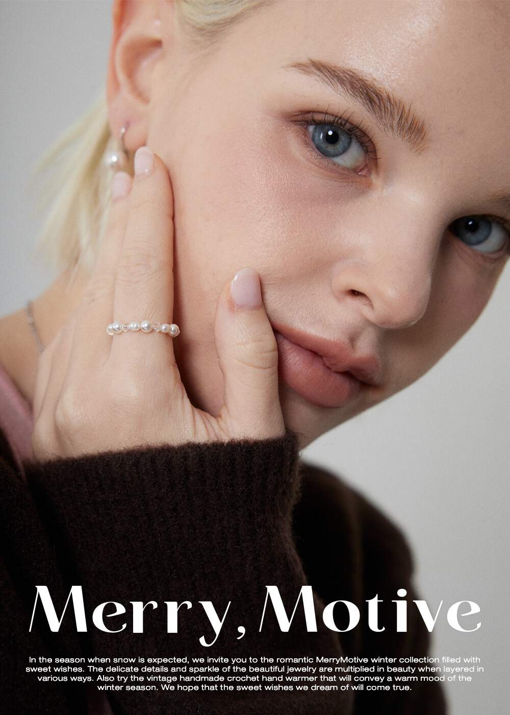 눈이 기다려지는 계절, 달콤한 소망을 담은 로맨틱한 메리모티브의 윈터 컬렉션에 초대합니다. 섬세한 디테일과 반짝임이 돋보이는 아름다운 주얼리는 다양하게 레이어드 할 수록 아름다움이 배가 됩니다. 윈터 시즌 포근한 무드를 전해줄 빈티지한 핸드메이드 크로셰 핸드 워머도 함께해 보세요. 우리가 꿈꾸는 달콤한 소망이 이루어지길 바라면서요.